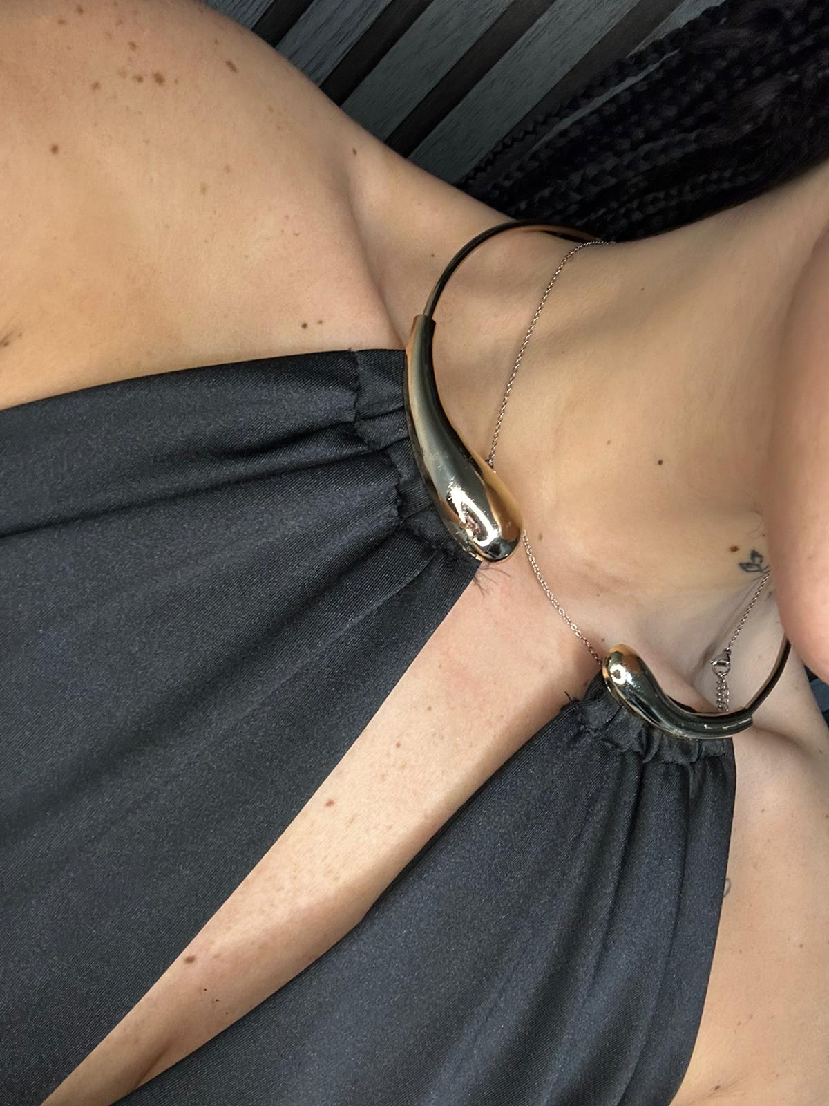 Questo elegante abito da sera è perfetto per una serata speciale. Con uno scollo profondo e schienale scoperto, ti farà sentire sicura e seducente. I dettagli della collana incorporata in oro aggiungono un tocco di lusso. Il tessuto di alta qualità e gli spacchi laterali completano l'aspetto.