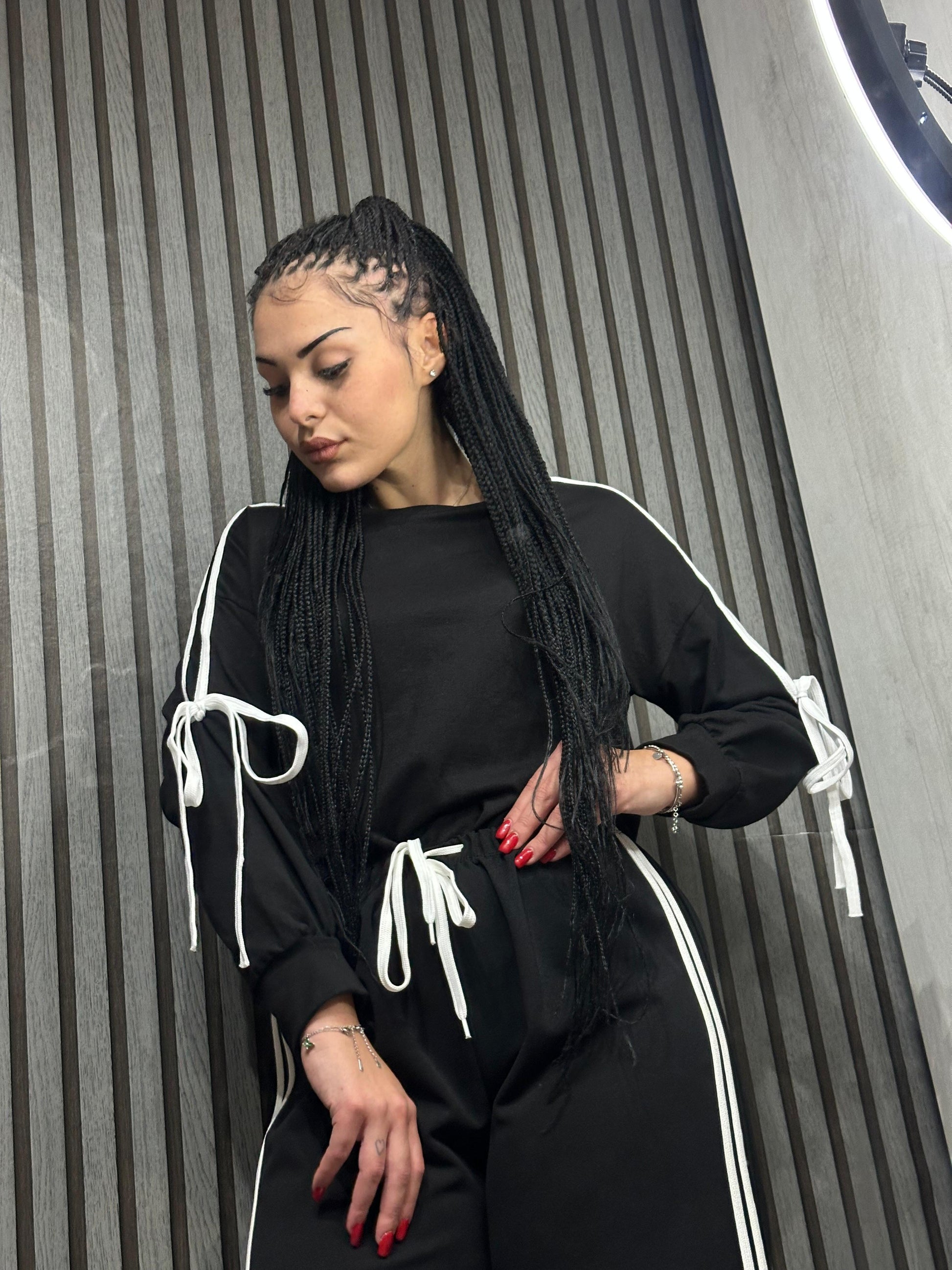 La tuta fiocco è la scelta perfetta per chi cerca un look classico e sportivo allo stesso tempo. Il particolare fiocco di lacci sulle braccia aggiunge un tocco elegante al capo, mentre il pantalone a palazzo con laccio ed elastico regolabile in vita garantisce comfort e vestibilità. Un capo versatile e di tendenza per un look impeccabile.